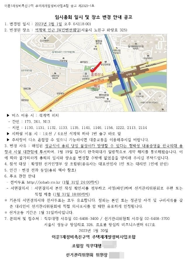이문1구역 정금식 조합장은 “지난 12월 해임총회는 조합원의 해임철회서를 거부하고 정족수 발표도 하지 않았기에 무효”라면서 “이에 대한 증거보전신청을 한 상황이라 2월 안에 법원 판결이 나올 것 같다”고 전했다.