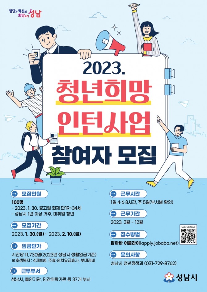 이 사업은 미취업 청년에게 성남시청, 시 출연·출자기관, 민간 위탁기관 등에서 10개월 간 일할 기회를 제공해 공공부문 실무와 경력을 쌓는 기회를 제공한다.