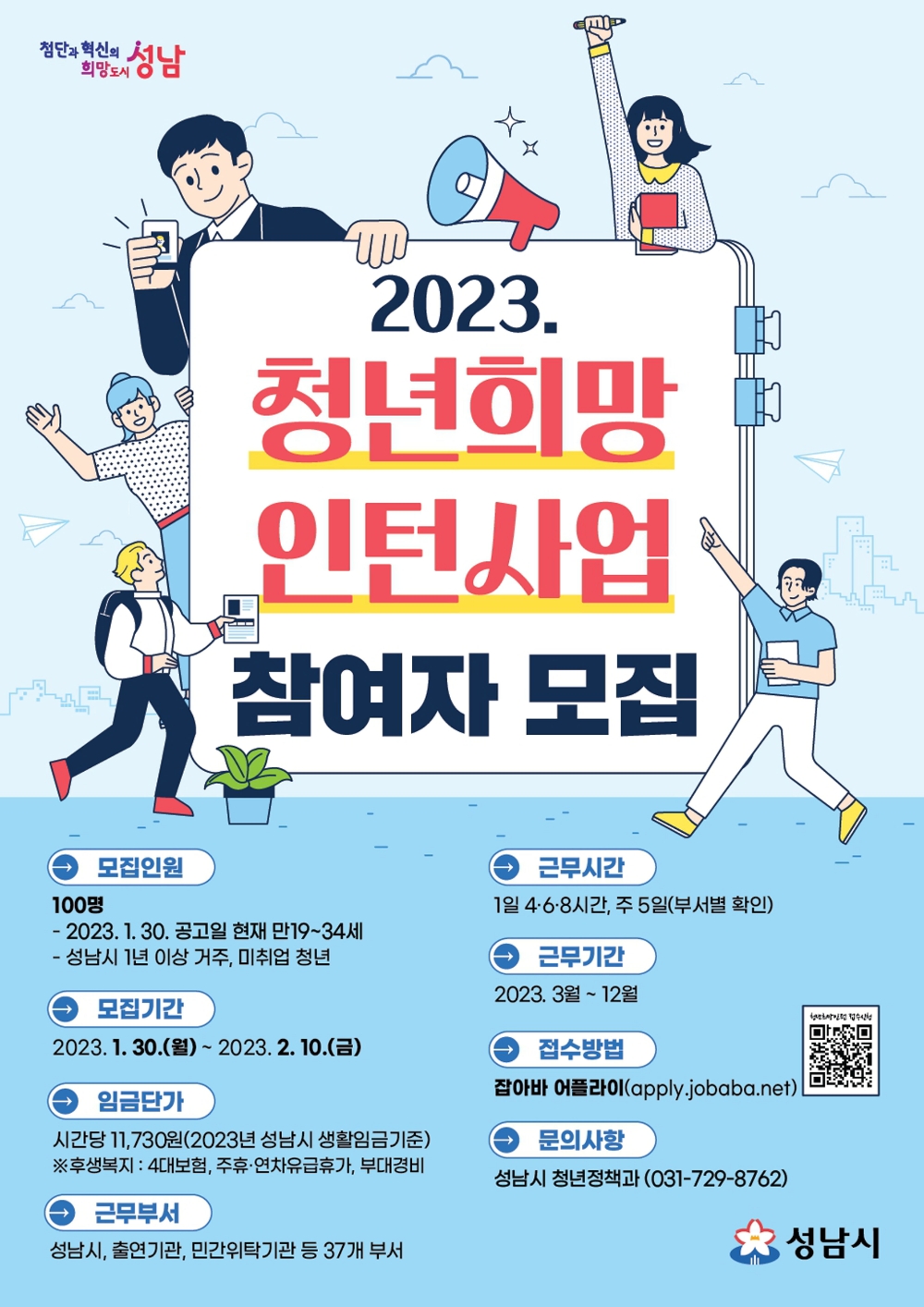 신청은 시 홈페이지에 있는 사업 부서별 지원 자격, 실무 내용 등을 확인한 뒤 잡아바 어플라이를 통해 참여 신청서, 자기소개서 등을 작성해 접수하면 된다. 선발되면 오는 2월 23일 개별로 알려준다.