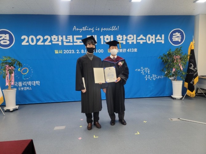 이미지 확대보기영천시 한국폴리텍특성화대학 로봇캠퍼스는 8일 교내 로봇관 콜레보토리실에서 2022학년도 학위수여식을 갖고 제1회 졸업생을 배출했다.