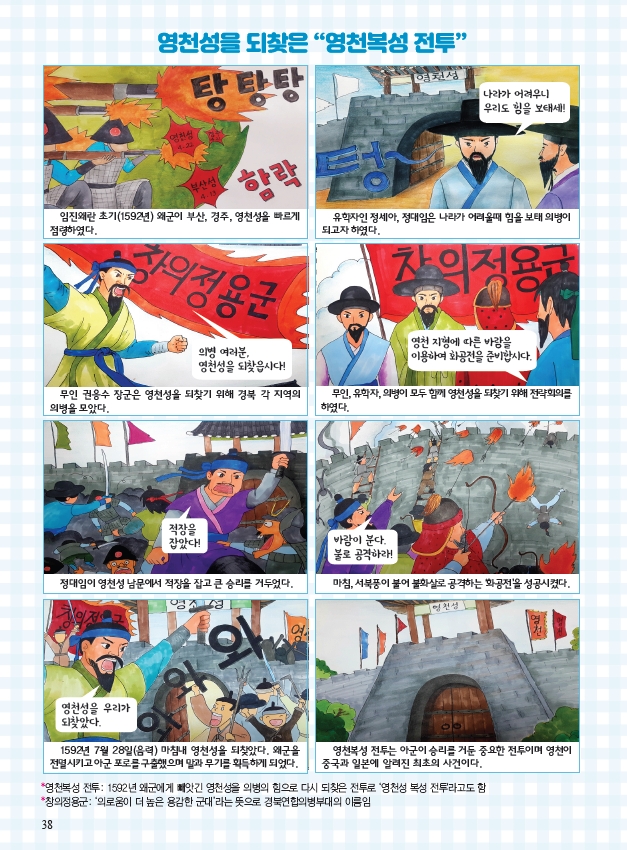이미지 확대보기사회과 지역교과서는 초등학생의 지역화 학습을 위해 활용하는 교과서로, ‘임란영천성수복대첩’을 교과서 2단원 중 ‘우리 고장의 옛이야기’ 부문에 만화삽화 형식으로 다뤄 초등학교 저학년이 이해하기 쉽도록 했다.