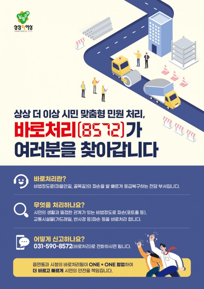 주광덕 남양주시장은 “바로처리팀을 계기로 앞으로도 공직자들이 시민들의 불편 사항 해결을 위해 맞춤형 민원 서비스를 제공할 수 있도록 최선을 다하겠다”며 “시민들이 더욱 만족할 수 있는 상상 더 이상의 민원 서비스를 위해 노력하겠다”고 전했다.