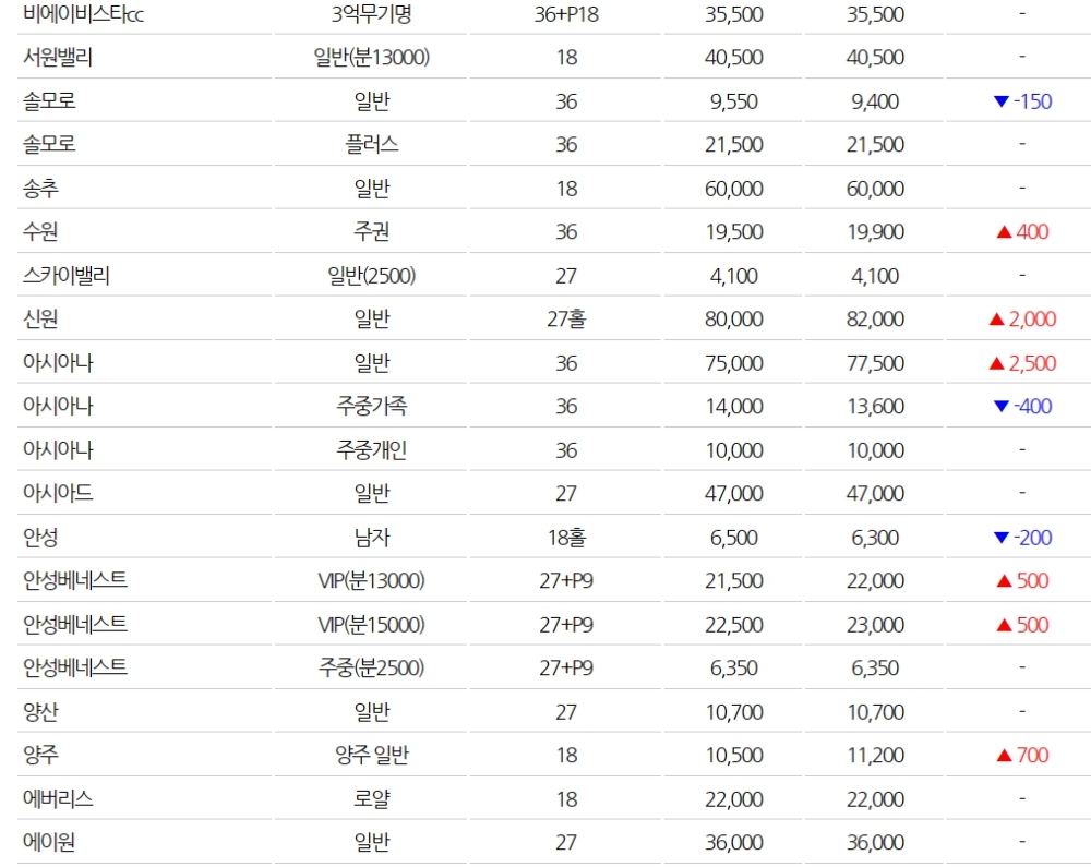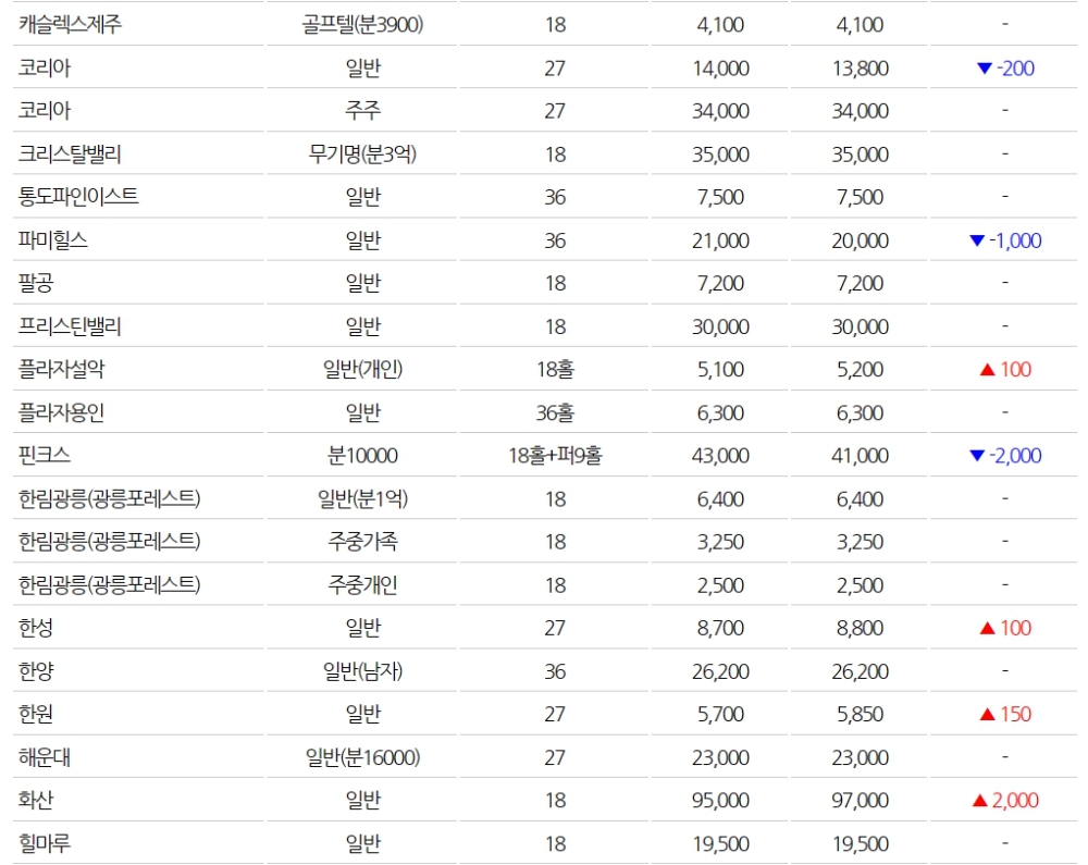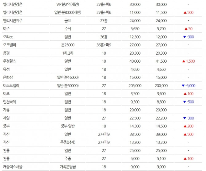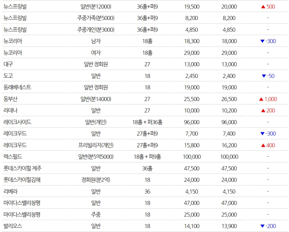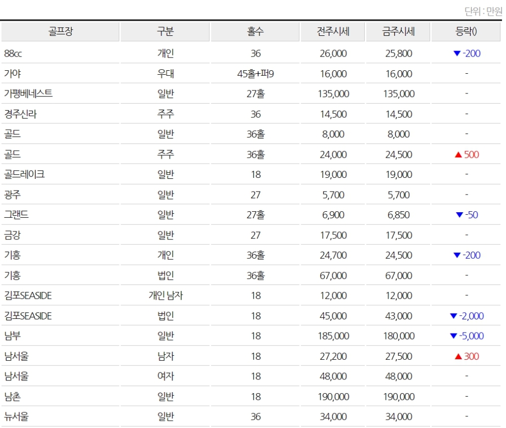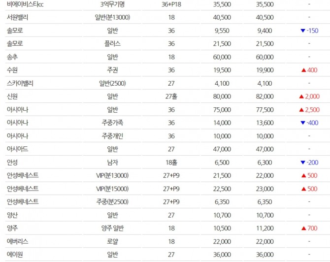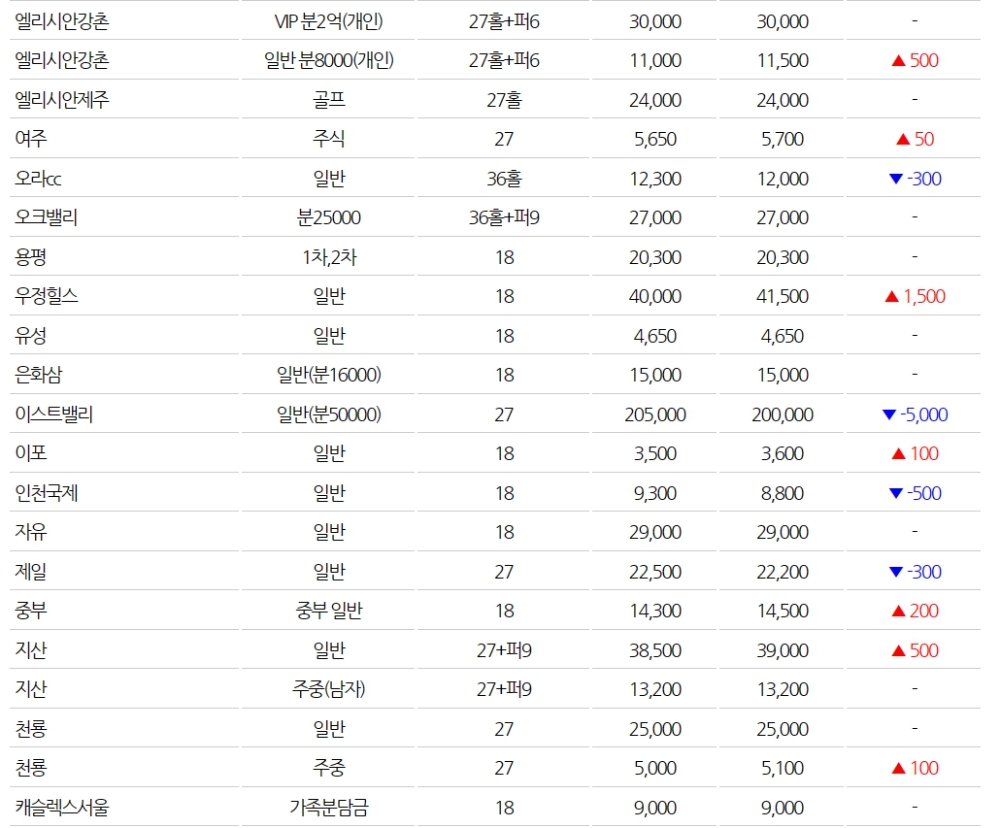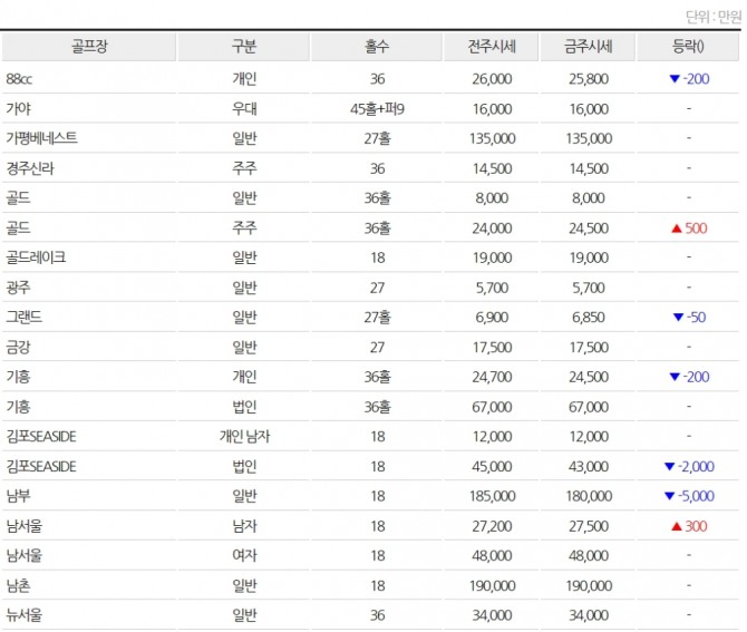 ◆전국 골프장 회원권 시세(3월1일)