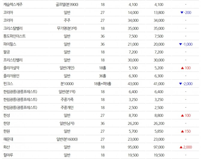 중저가 회원권들은 보함세를 유지하고 있는 가운데 일부 골프장들은 상승과 하락이 교차됐다. 우정힐스는 1500만원이 올라 4억1500만원에 거래중이고, 동부산도 1000만원이 오른 2억65000만원이다. 핀크스는 2000만원 내려 4억1000만원이고, 파미힐스는 1000만원이 내린 2억원의 매매가를 형성하고 있다.