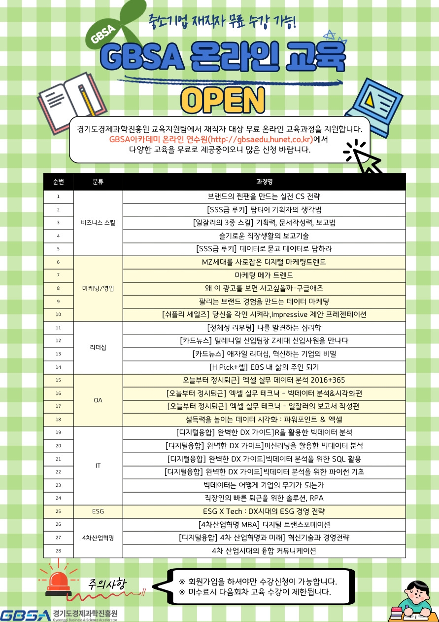 신청 방법은 GBSA 아카데미 온라인 연수원에서 신청하면 되고, 오는 12월까지 원하는 시기에 여러 과정을 동시에 수강이 가능하다.
