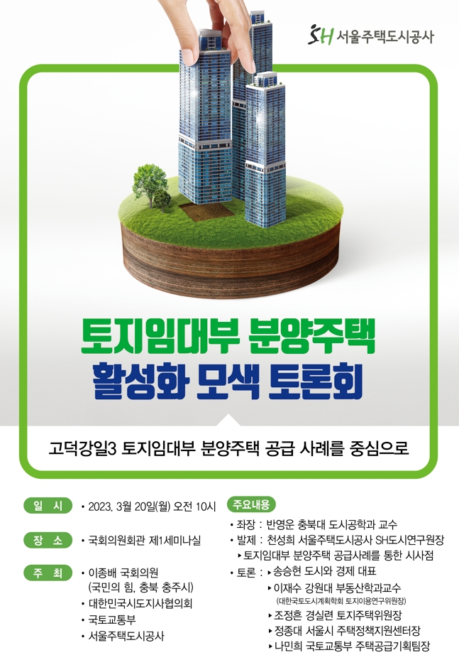 이미지 확대보기서울주택도시공사(사장 김헌동, SH공사)와 이종배 국회의원(국민의힘, 산업통상자원중소벤처기업위), 대한민국시도지사협의회 및 국토교통부가 3월 20일 오전 10시 국회의원회관 제1세미나실에서 ‘토지임대부 분양주택 활성화 모색 토론회-고덕강일3 토지임대부 분양주택 공급 사례를 중심으로’를 개최한다고 밝혔다.