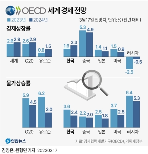 내년 세계 경제 성장률(2.9%)도 직전 전망보다 0.2%포인트 상향 조정됐다. OECD는 "기업·소비 심리 개선과 에너지·식량 가격 하락, 중국의 완전한 리오프닝(경제활동 재개) 등 긍정적 신호가 나타나고 있다"며 "특히 한국과 호주는 중국 성장 반등에 따른 수혜로 타이트(tight)한 금융 여건에 따른 영향을 상쇄할 전망"이라고 분석했다.