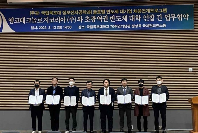 이미지 확대보기이번 협약은 목포대 정보전자공학과 전희석 교수가 총괄 책임자로 하여 앰코테크놀로지코리아(주)와 7개 대학(목포대, 전남대, 전북대, 강릉원주대, 한국교통대, 대구대, 부산대) 및 2개 연구기관(서울대 반도체공동연구소, 한국나노기술연구원) 그리고 LINC 3.0 반도체 인력양성 협의회와 반도체 후공정 특화분야에 대한 공동 인력양성 및 채용연계 프로그램 공동운영을 목적으로 한다.