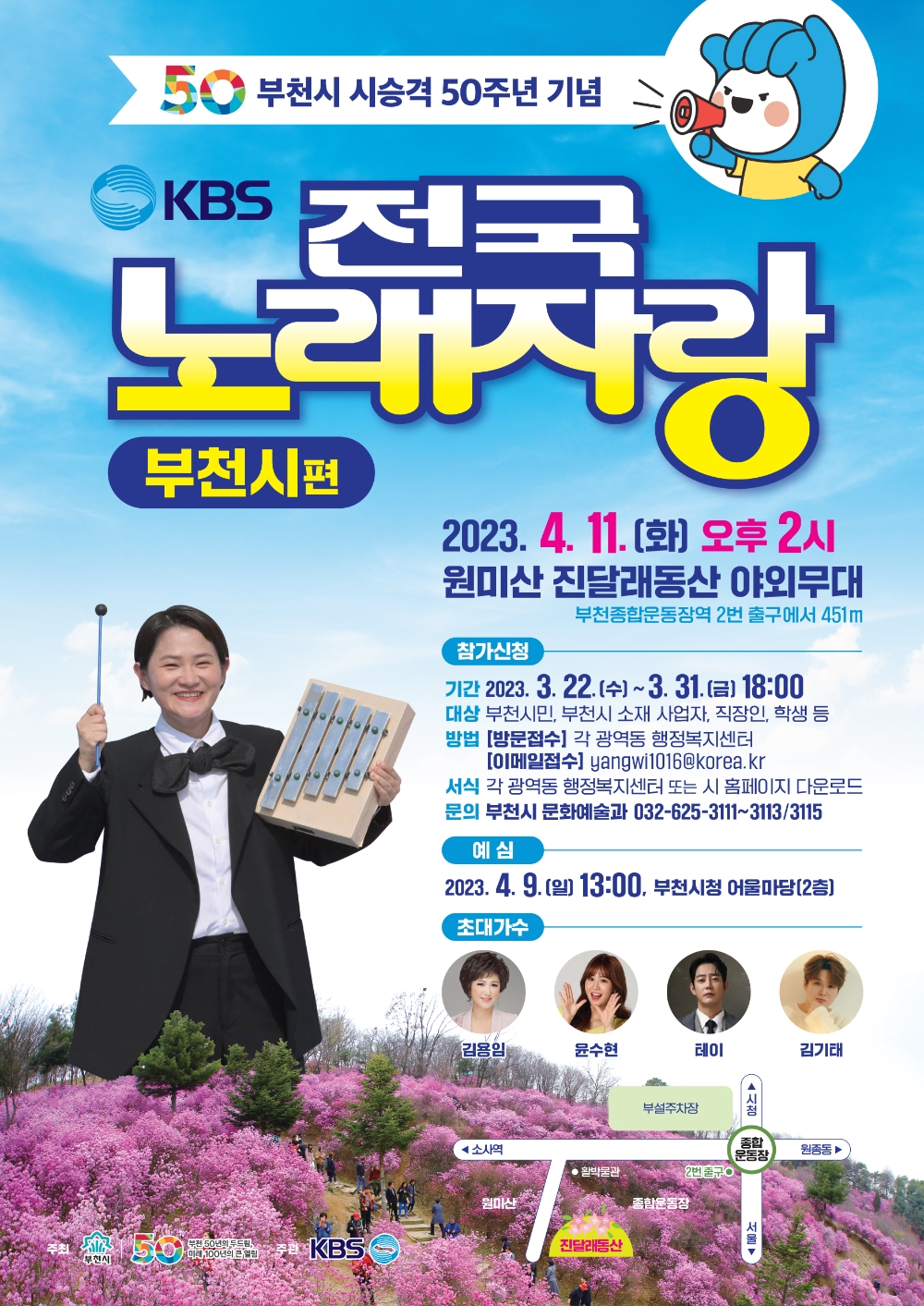 이미지 확대보기경기도 부천시는 시 승격 50주년을 기념해 전 국민의 사랑을 받는 ‘KBS 전국노래자랑’을 다음달 11일 오후 2시 원미산 진달래동산 야외무대에서 개최한다고 밝혔다.
