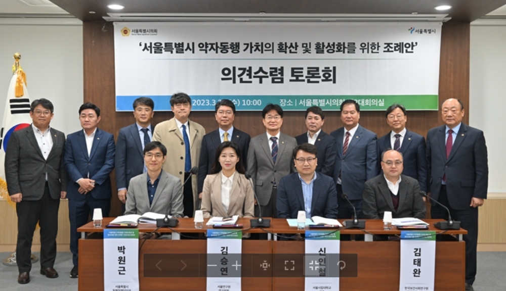 처음 박원근 서울시 동행정책담당관이 ▲약자의 정의 ▲시장의 책무 ▲비용지원 및 사무 위탁 근거 ▲기본계획의 수립 ▲실태조사 근거 등 ‘서울특별시 약자동행 가치확산 및 활성화를 위한 조례안’의 주요 내용을 설명했다.