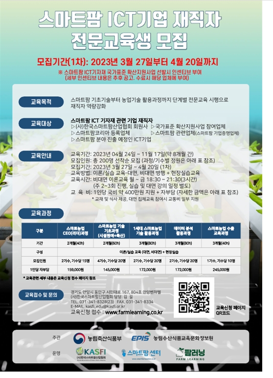 이 사업의 위탁운영 기관인 (사)한국스마트팜산업협회는 오는 11월까지 총 11회에 걸쳐 이론교육과 현장실습교육을 병행하는 전문과정을 운영한다고 밝혔다.