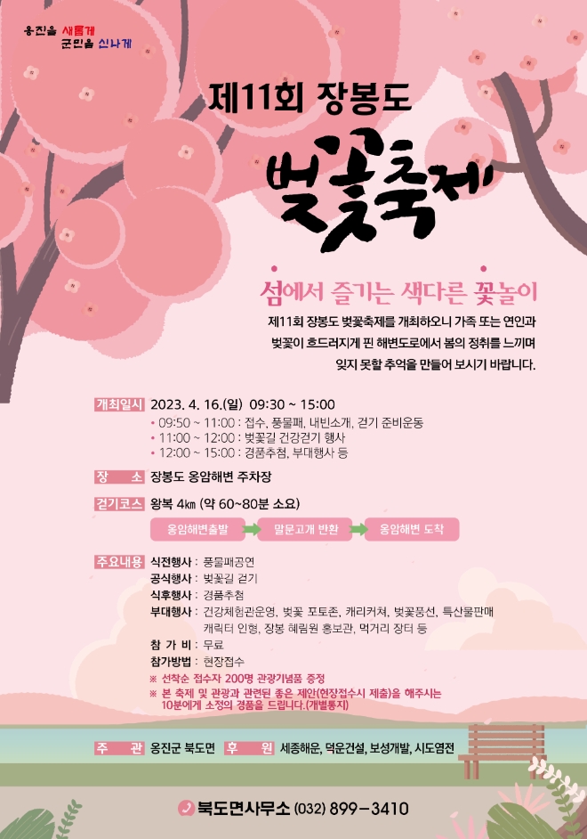 여명옥 면장은 “코로나 이후 4년 만에 개최되는 ‘장봉도 벚꽃축제’에 가족과 친구, 연인 등 많이 참가해 친목과 건강을 도모하는 경험을 하길 바란다”고 전했다.
