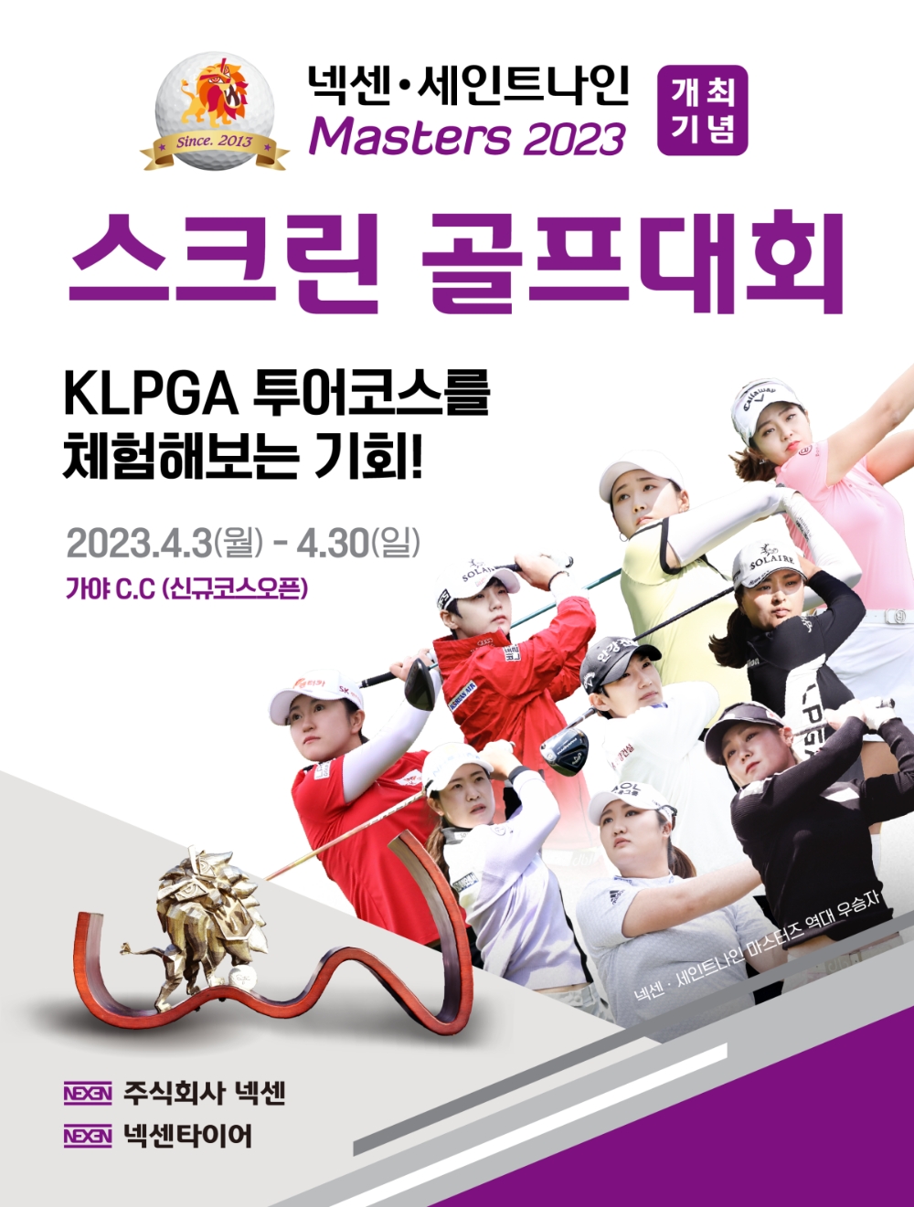 이미지 확대보기'넥센-세인트나인 마스터즈 2023 스크린 골프대회'는 오는 21일 KLPGA 투어 넥센-세인트나인 마스터즈 2023이 열리는 가야컨트리클럽 신어-낙동 코스(파72)에서 선수들과 동일한 조건에서 스크린 골프를 체험할 수 있다.