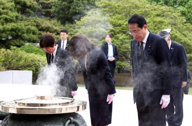 국립현충원에 도착한 기시다 총리와 요코 여사는 현충원으로 입장하다 멈춰 서 '국기에 대한 경례' 구호에 태극기를 향해 허리를 숙여 경례했다. 태극기 옆에는 일본 국기도 게양됐다.