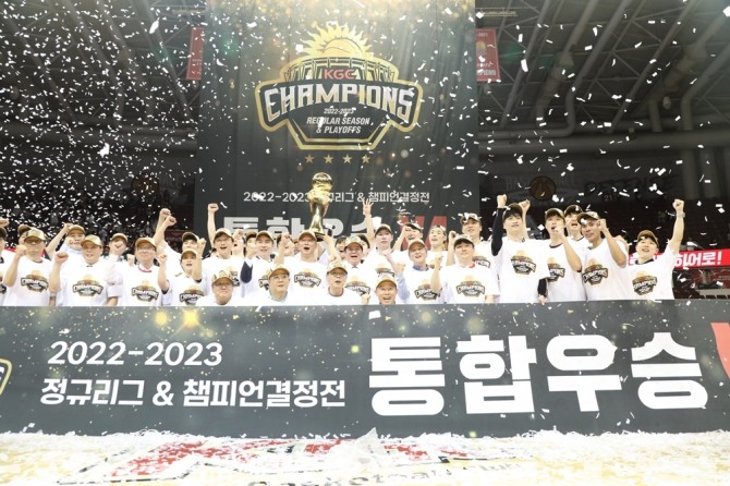 이미지 확대보기지난 7일 안양체육관에서 열린 2022~2023 프로농구 챔피언결정전 7차전에서 연장전까지 가는 접전 끝에 KGC인삼공사가 서울SK에 100대 97로 승리했다.