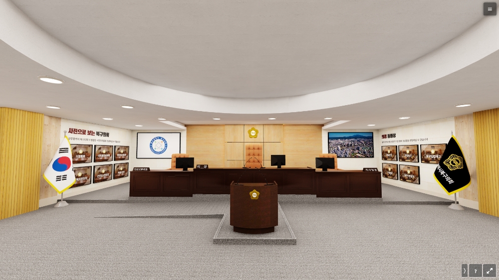 이미지 확대보기북구의회 본회의장을 3D 인터페이스로 형상화한 e-홍보관은 VR(가상현실) 기술을 활용한 영상·이미지 중심의 컨텐츠로 구축하여 실제 의회를 방문하여 직접 체험하는 느낌을 구현하였다.