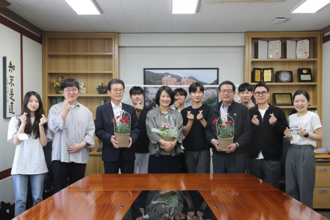 이미지 확대보기총학생회 간부들이 재학생을 대표해 이주희 총장과 송경용 대외협력부총장, 전진 교학부총장에게 카네이션을 전달하며 스승의 날 의미를 되새기는 시간을 가졌다.