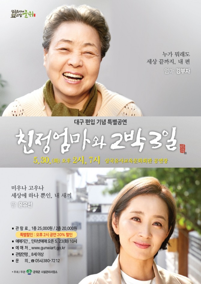 이미지 확대보기삼국유사교육문화회관에서는 5월 가정의달, 어버이날을 맞아 부모님께 감사의 마음을 담아 연극 ‘친정엄마와 2박3일’을 오는 30일 오후 2시, 7시 두 차례에 걸쳐 선보인다.