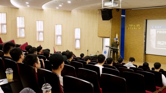 이미지 확대보기동신대 군사학과는 30일 오후 대정3관 투게더홀에서 문 중위를 초청해 ‘졸업 선배 초청 특강 및 장학금 전달식’을 개최했다.