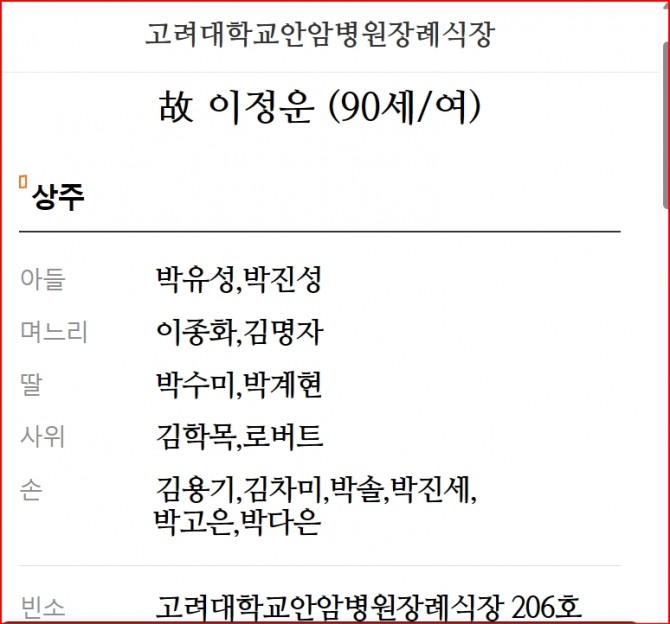 [부고] 박유성 (고려대 명예교수) 모친상= 이정운 (90세 여) 별세 아들 박유성 박진성 고려대 안암병원 발인 6월2일