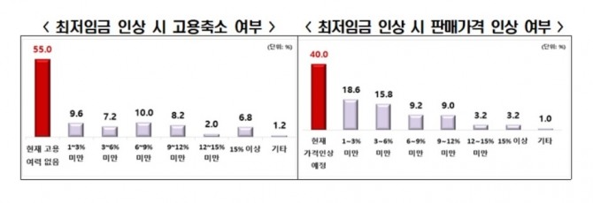 최저임금이 얼마나 인상되면 판매가격을 인상할 것인지에 대한 질문에 자영업자 10명 중 4명(40.0%)은 최저임금을 인상하지 않더라도 이미 판매가격 인상 계획을 가지고 있다고 응답했다. 최저임금을 1~3% 미만 인상 시 18.6%, 3~6%미만 인상 시 15.8%가 판매 가격을 인상하겠다고 답했다.