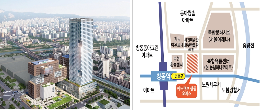 ‘씨드큐브 창동’(조감도 참조)은 이번에 공급하는 오피스 업무시설(지상1층~16층) 외에도 오피스텔 792실(지상6층~49층), 상업시설(지상1층~5층), 공영주차장 등을 갖춘 복합시설물로, 일자리, 의료·바이오, 창업문화허브 등 동북권의 비즈니스 중심지로 떠오르게 될 전망이다.