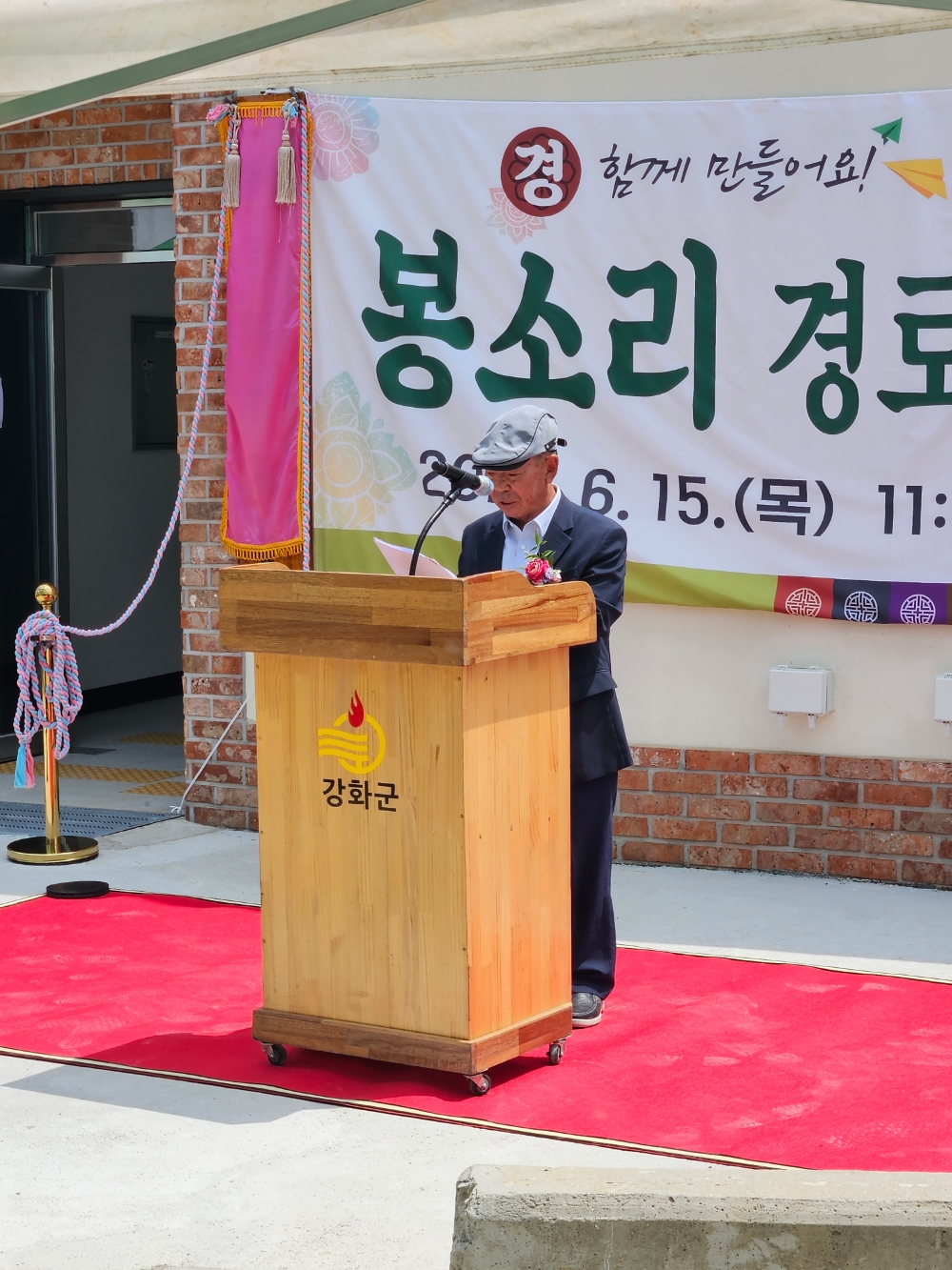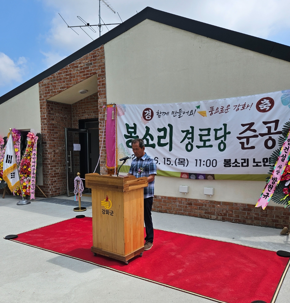 축사로는 박승한 군의장, 지역구인 오현식 의원, 박용철 시의원 순으로 축사를 마치고, 대한노인회 장기천 강화군 지회장은 축사에서“교동대교 건설 전에는 남선포와 월선포가 관문이였지만 대교 개통 이후는 봉소리가 교동면 관문이다. 살기좋고, 인심 좋은 교동면 관문인 봉소리 마을에 최신식 노인정이 준공돼 저도 기쁘다”며 축하를 했다.