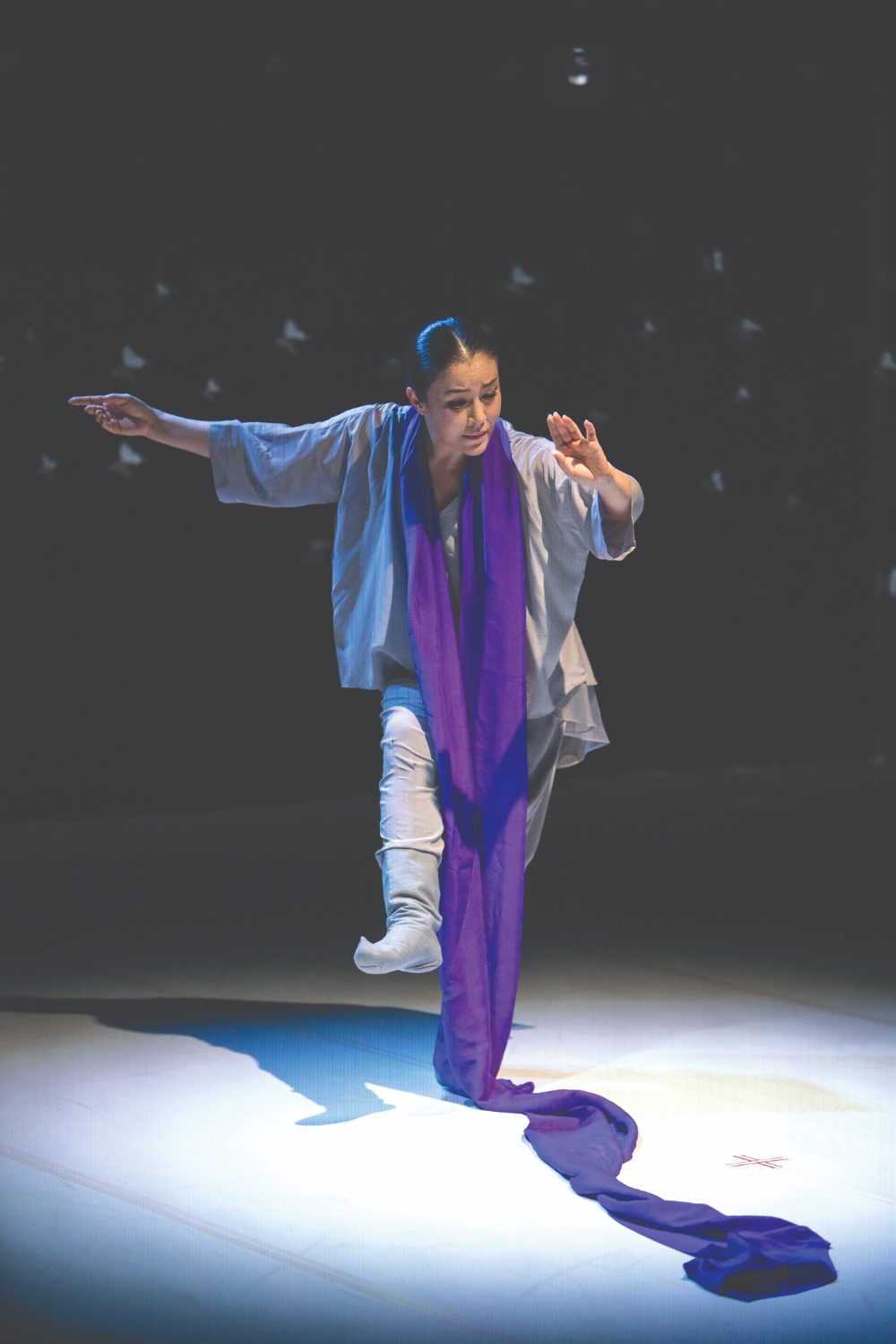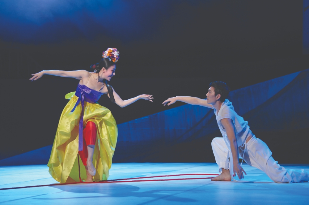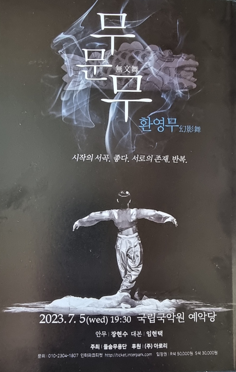 이미지 확대보기거침없는 전진의 들숨무용단이 주최하고, ㈜아로리가 후원하는 장현수 안무·임현택 각본의 한국창작무용 『무문무』(無文舞, 부제 환영무幻影舞)는 궁금증을 일으키는 특별한 공연이다. ‘무문무’, ‘춤의 장식적 묘사는 한계가 없고, 성찰의 깊이도 끝이 없다.’라는 뜻으로 읽힌다. 그러다 보면 그림자와도 춤출 수 있는 경지에 오르지 않을까 하는 상상에 도달한다. 그런 경지의 춤은 선무(仙舞)이거나 선무(禪舞)이다. 『무문무』에서 선무적 춤을 연출한 장현수는 ‘춤은 영혼을 담아 호흡을 통해 생명체로 존재할 수 있음’을 밝혀낸다.