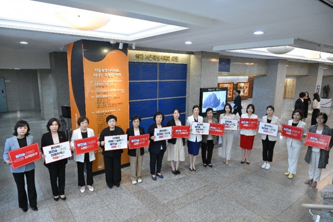 이미지 확대보기국민의힘 신복자 여성의원협의회 회장을 비롯해 21명 여성의원들은 본회의가 진행된 회의장 앞에서 동료의원들에게 사태의 심각성을 알리고 동참해 줄 것을 호소했다.