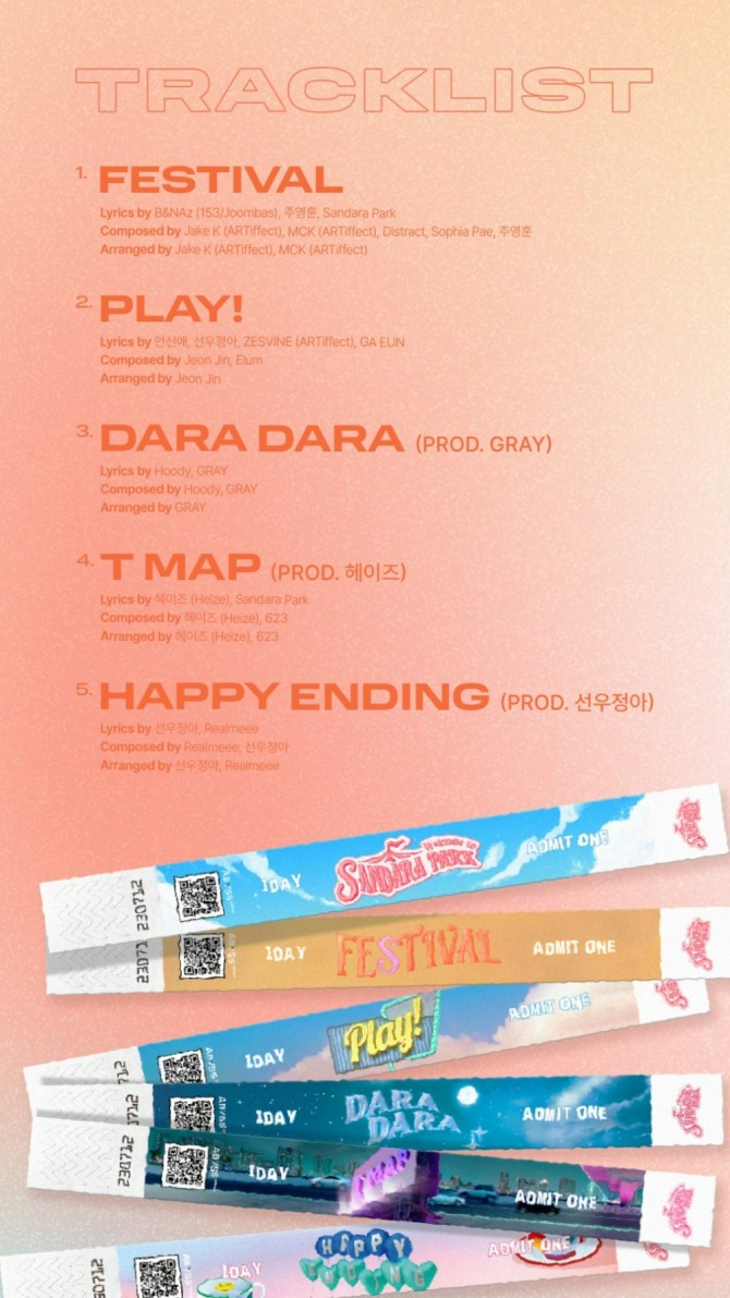 이미지 확대보기6월 30일 어비스컴퍼니에 따르면 이날 산다라박의 공식 소셜네트워크서비스(SNS) 채널을 통해 오는 7월 12일 발매되는 디지털 미니앨범 'SANDARA PARK'의 트랙리스트가 공개됐다. 트랙리스트에는 타이틀곡인 'FESTIVAL'을 포함해 총 5곡의 곡명 및 정보가 표기돼 있다.