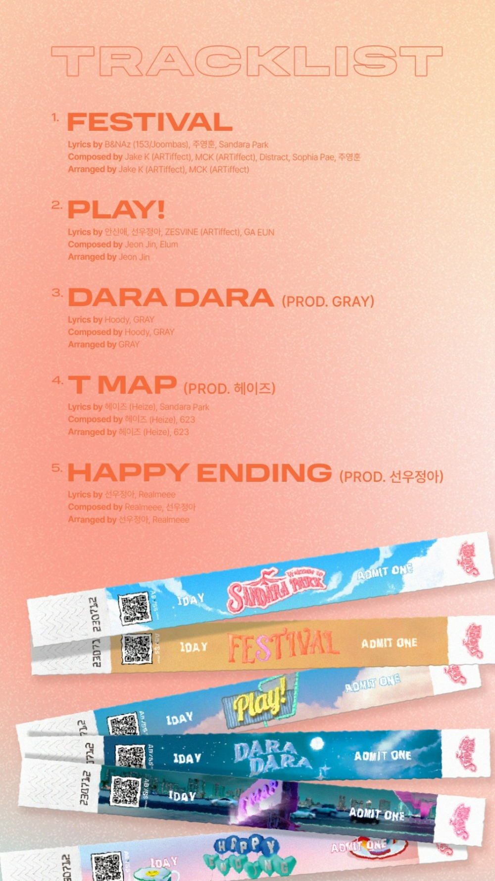 수록곡의 화려한 프로듀싱 라인업도 돋보인다. 3번 트랙 'DARA DARA'에는 그레이(GRAY)가, 4번 트랙 'T MAP'에는 헤이즈(Heize), 5번 트랙 'HAPPY ENDING'에는 선우정아가 각각 프로듀서로 참여하며 완성도를 더했다.