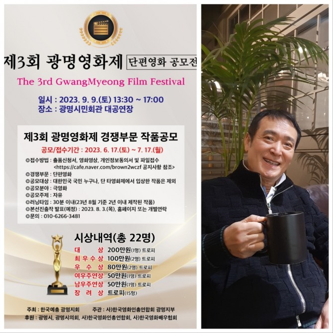 한국영화인총연합회광명지부(회장 나기수) 주관하고 한국예총광명지회가 주최하는 제3회 광명영화제(The 3rd GwangMyeong Film Festival, 집행위원장 나기수) 단편영화 공모가 예년의 성과를 넘어 열기를 더해가고 있다. ‘훌륭한 영화인 발굴’과 ‘광명시 영화예술 문화도시 발전’이라는 슬로건의 이 영화제는 전국에서 제작된 30분 이내의 단편영화(2023년 8월 기준 2년 이내 제작된 작품)를 6월 17일부터 공모해왔고 7월17일까지 공모한다.