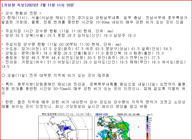 이미지 확대보기기상청은 2023년 7월 11일 11시 10분에 발령한 일기예보 특보에서 서울(서남권 제외).인천.경기도와 강원남부내륙, 일부 충남, 전남서부에 호우특보가 발효된 가운데, 돌풍, 천둥.번개를 동반한 시간당 10~30mm 내외의 매우 강한 비가 오는 곳이 있다고 밝혔다. 주요지점 1시간 강수량 현황 (11일 11:00 현재, 단위: mm)은 청양 33.5 성북(서울) 29.5 평창 26.5 임자도(신안) 19.0 남양주 18.0이다.