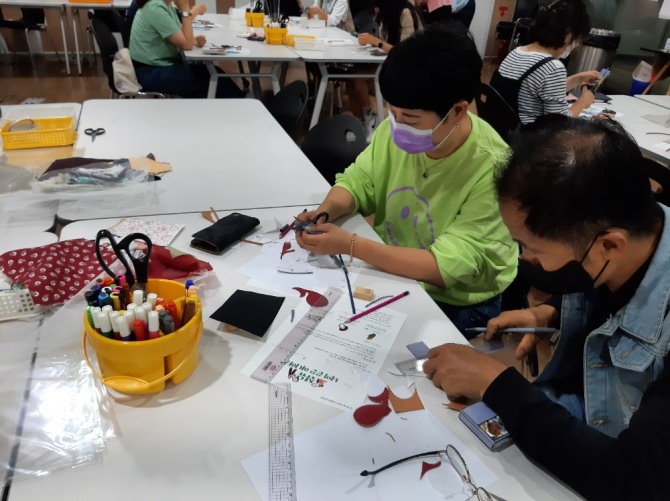 새활용 체험은 박물관이 섬유회사에서 기부 받은 여러 재질의 원단을 이용해 다이어리 표지 만들기와 쇼파나 신발을 만들고 버려지는 자투리 가죽을 이용한 책갈피 만들기 두 가지가 있다.
