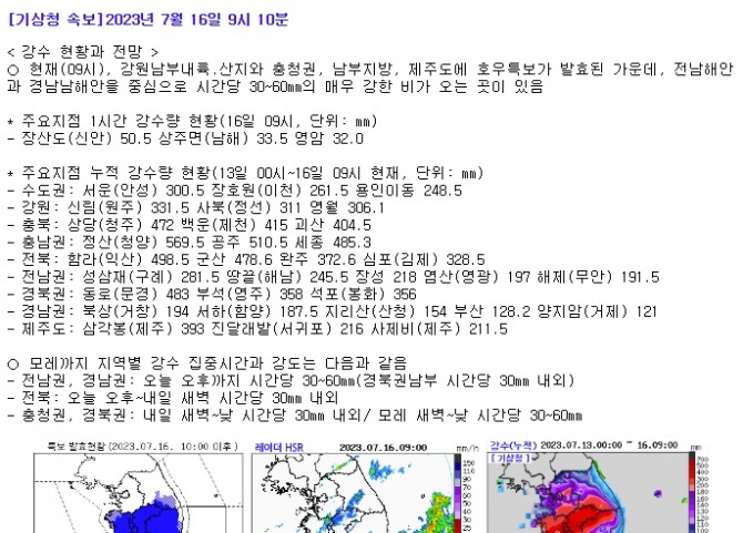 이미지 확대보기기상청은 2023년 7월 16일 9시 10분 발표한 전국 일기예보 특보에서 오늘 내일날씨가 중대 고비를 맞고 있다고 밝혔다. 기상청은 강원남부내륙.산지와 충청권, 남부지방, 제주도에 호우특보가 발효된 가운데, 전남해안과 경남남해안을 중심으로 시간당 30~60mm의 매우 강한 비가 오는 곳이 있다고 밝혔다. 주요지점 1시간 강수량 현황(16일 09시, 단위: mm)은 장산도(신안) 50.5 상주면(남해) 33.5 영암 32.0이다.