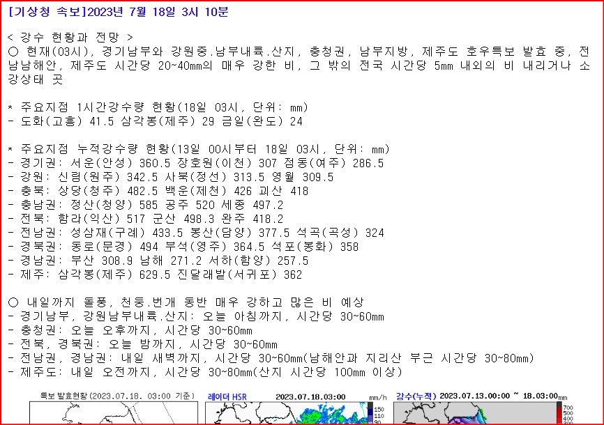 ○ 현재(03시), 경기남부와 강원중.남부내륙.산지, 충청권, 남부지방, 제주도 호우특보 발효 중, 전남남해안, 제주도 시간당 20~40mm의 매우 강한 비, 그 밖의 전국 시간당 5mm 내외의 비 내리거나 소강상태 곳