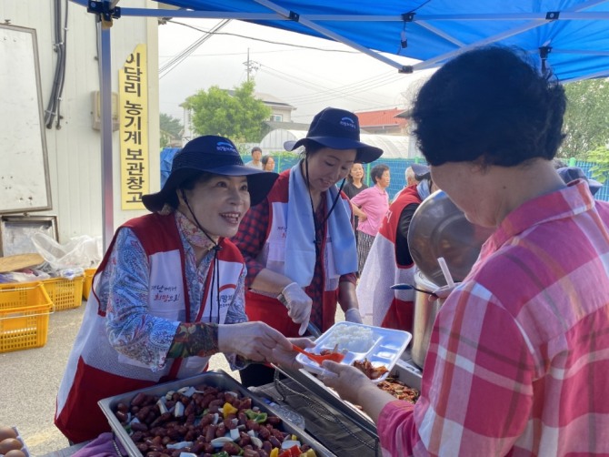 희망브리지 봉사단이 21일 충북 괴산 원이담마을에서 호우 피해를 본 주민을 위해 식사를 배식하고 있다. /사진=희망브리지