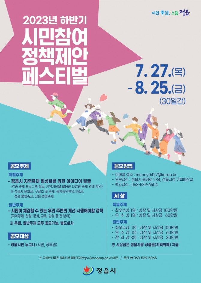 응모 방법은 정읍시 홈페이지에서 신청서를 내려받아 작성한 후, 우편(정읍시 충정로234 정읍시청 기획예산실) 또는 팩스로 제출하거나 이메일로 전송하면 된다.