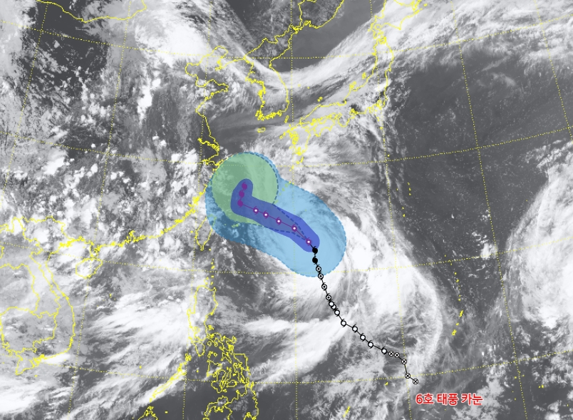 이미지 확대보기일본 오키나와 남동쪽 해상에서 중국으로 향하던 6호 태풍 ‘카눈’의 예상 이동 경로가 바뀌었다고 기상청이 발표했다.