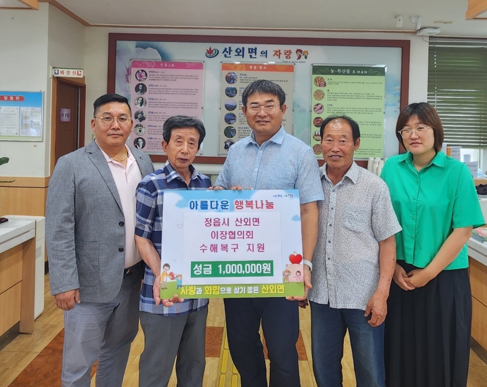 이미지 확대보기전북 정읍시 산외면 이장협의회(회장 김은귀) 소속 34명은 지난달 발생한 집중호우로 피해를 입은 주민들을 돕기 위해 자발적으로 모금을 실시, 십시일반 모은 피해복구 성금 100만원을 기탁했다고 16일 밝혔다.