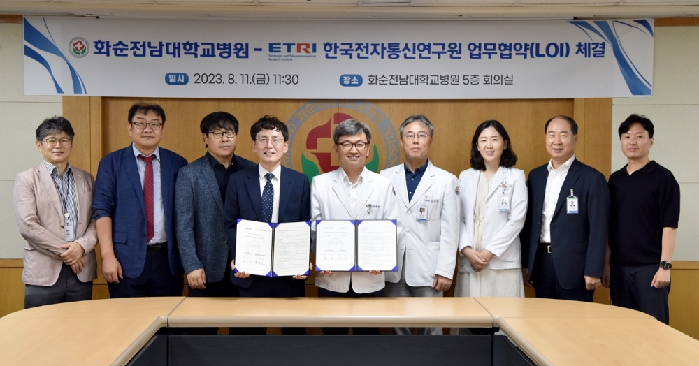 이미지 확대보기협약식에는 정용연 병원장과 김인영 진료처장을 비롯해 강현서 ETRI 호남권연구센터장, 이종진 ETRI 광패키징연구실장 등 관계자들이 참석해 의료분야 인공지능, 데이터 수집, 인공지능 개발, 평가 및 인증 등을 위해 상호 협력하기로 했다.
