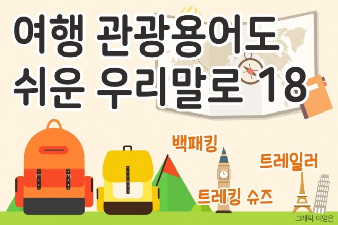 등산이나 소풍 갈 때 메고 다니는 백팩(backpack)은 우리말로 ‘배낭’이다. 배낭이라는 말이 언제부터인가 백팩으로 대체되고 있다. 국어 사용 후퇴의 대표적인 사례다. 배낭보다 백팩이 더 좋아 보이는가? 백패킹(backpacking)은 1박 이상의 야영(들살이) 생활에 필요한 장비를 넣은 배낭을 짊어지고 산과 들을 마음 내키는 대로 자유롭게 걸어 다니는 여행을 말한다. 우리말은 ‘배낭 도보여행’이다.