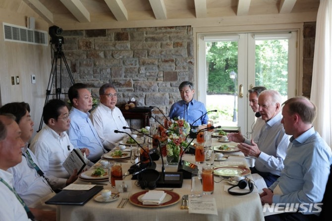 이미지 확대보기세 정상은 '공약'에서 “한미일 간 공동의 이익과 안보에 영향을 미치는 지역적 도전, 도발, 그리고 위협에 대한 대응을 조율하기 위해 신속하게 협의하도록 공약한다”고 밝혔다. 이 공약은 한미 동맹과 미일 동맹의 공약을 침해하지 않으며 국제법 또는 국내법에 규정된 권리 또는 의무를 새롭게 만들지는 않는다고 규정했다. '정신'에는 한미일 간 포괄적 협력 방안이 포함됐다. '원칙'에는 향후 한미일 협력을 추진하는 과정에서 지켜야 할 내용이 담겼다.