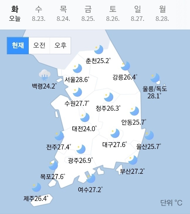 오늘 서울 낮 기온을 29도로 예측한 기상청은 전국에서 비가 일찍 내리는 수도권 기온이 낮아지면서 예년 수준을 회복할 것으로 전망했다. 하지만 광주 34도, 대구 33도, 대전 32도 등 다른 지역은 폭염이 이어지겠다.
