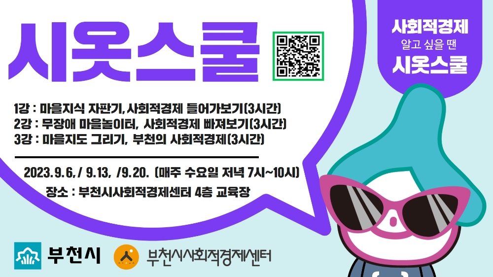 이미지 확대보기부천시는 시민 및 관내 기업 또는 학교 임직원과 학생들을 대상으로 9월 5일까지 ‘사회적경제 시옷스쿨 제4기 수강생’을 모집한다고 24일 밝혔다.