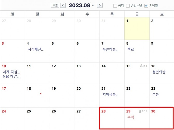 임시공휴일 지정시 추석연휴 9월28일부터 10월3일까지 6일(엿새)