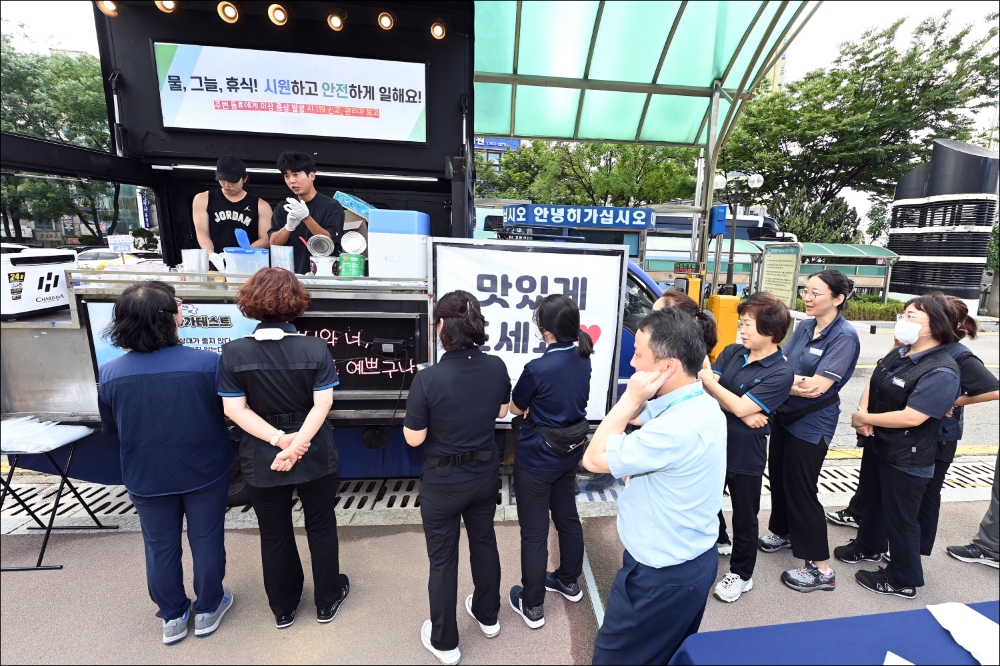 푸드트럭에는 ‘온열질환 자가진단표’를 게시해 야외 근로자들이 스스로 건강상태를 확인하고 온열질환을 예방할 수 있도록 했으며, 음료와 컵빙수, 수박화채를 제공하고 건강상담을 진행해 근로자 건강 보호에 힘썼다.