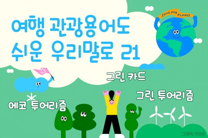 그린 투어리즘(greentourism)은 녹색의 그린(green)이 들어간 말로 농촌 도시민과 농촌 주민의 교를 통해 농촌의 자연 경관, 전통문화, 생활과 산업 따위를 체험할 수 있는 체류형 여가 활동을 의미한다. 생태관광과 가장 두드러진 차이점은 농촌이 들어간다는 점이다. 국립국어원은 우리말로 ‘녹색관광’이라고 정했다. 이들 두 가지가 합쳐진 에코 그린 투어리즘(eco green tourism)은 생태관광과 녹색관광을 융합한 개념으로 볼 수 있다. 국립국어원은 ‘친환경 여행’으로 정했다. 문제는 ‘친환경’이 범위가 너무 넓고 다양하기에 다소 모호한 측면이 있다. 그래서 필자는 차라리 단어 뜻 그대로 살려 ‘생태녹색관광’으로 하면 좋겠다.