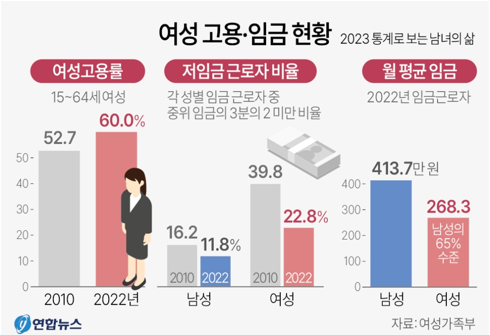 지난해 15∼64세 여성 고용률은 처음으로 60%에 진입했다. 이는 2010년52.7%보다 7.3%포인트 상승한 것이다. 그러나 여성 임금 근로자 중 중위임금의 3분의 2 미만인 저임금 근로자는 22.8%로 남성 저임금 근로자 11.8%에 비해 2배 정도 많았다.