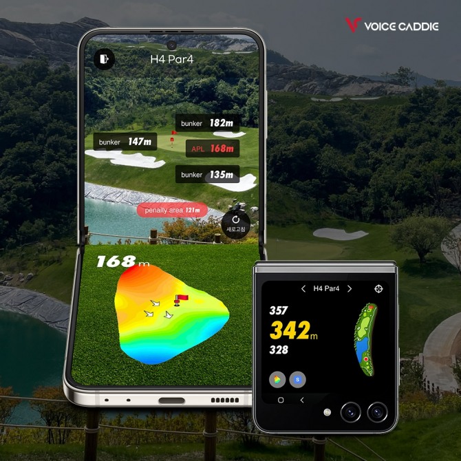 이미지 확대보기갤럭시 Z 플립5 보이스캐디 에디션은 삼성전자 ‘갤럭시 Z 플립5’ 휴대폰에 보이스캐디의 ‘APL골프’ 앱 기술력을 넣어 휴대폰에서도 라운드에 필요한 코스 공략과 실시간 핀 위치 서비스를 이용할 수 있다.